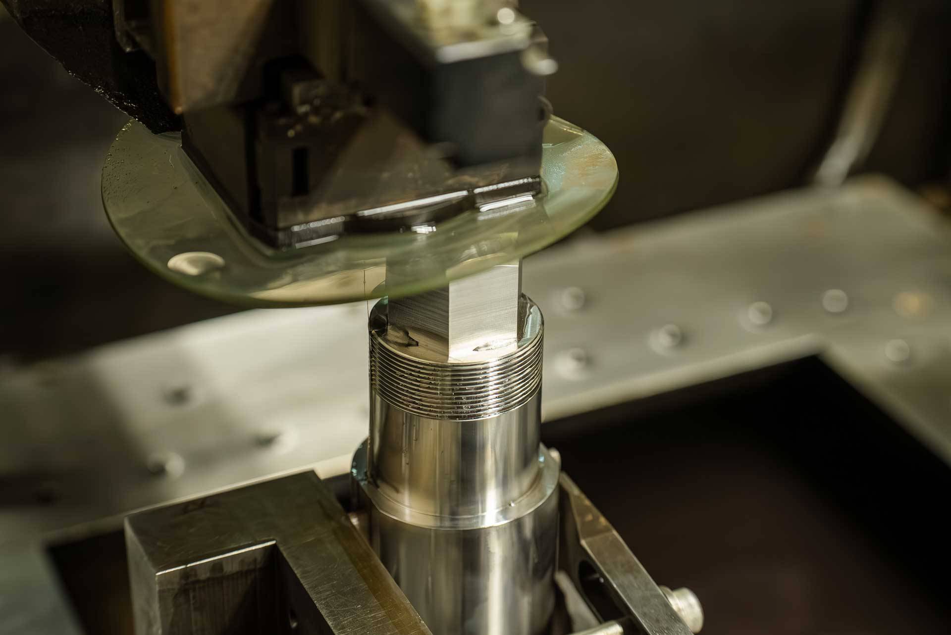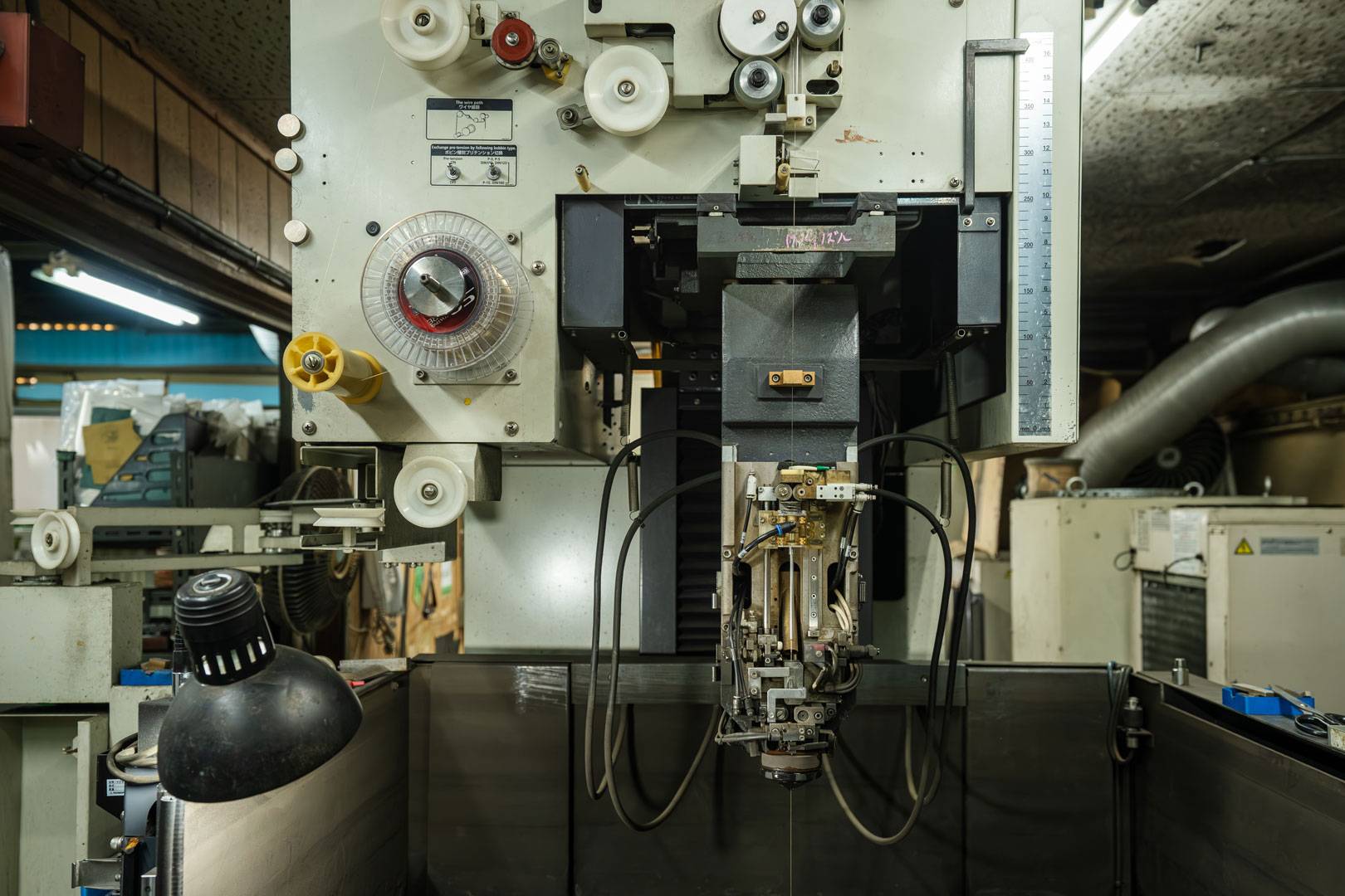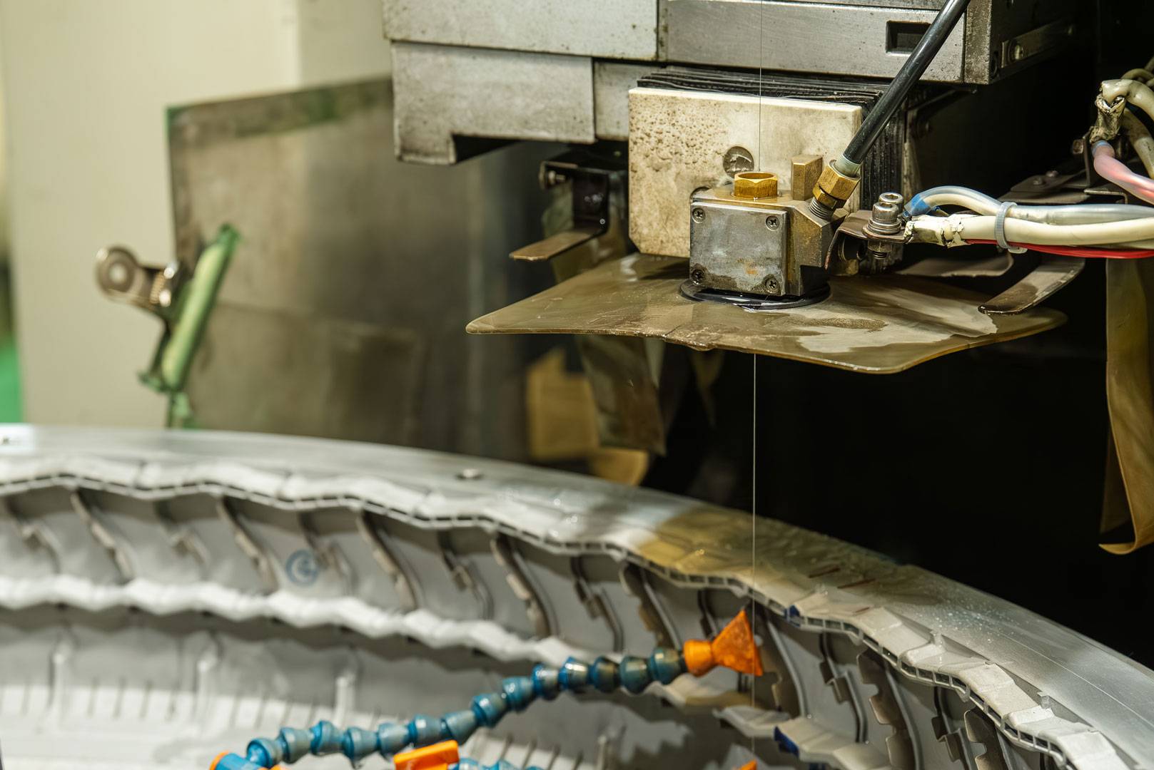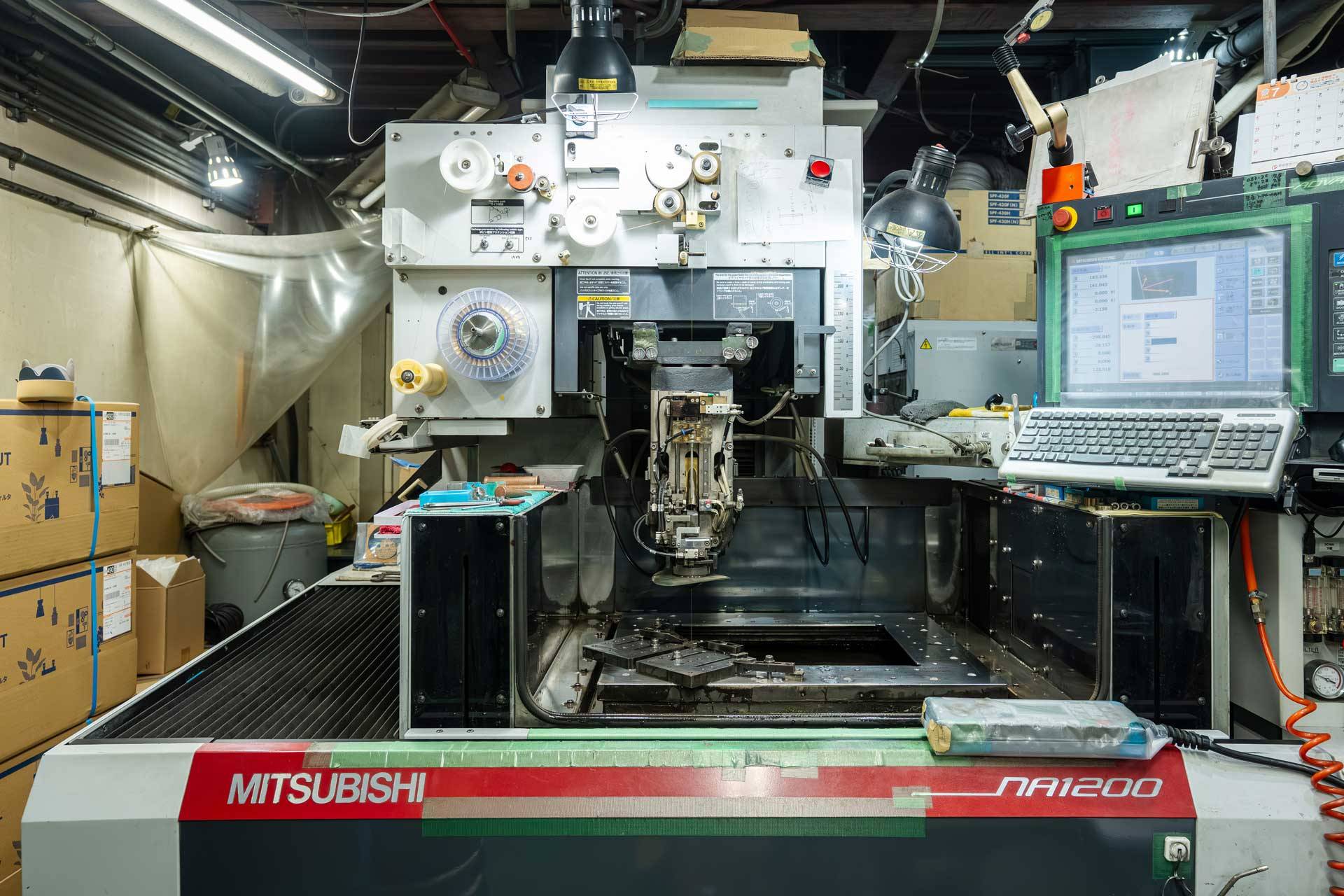 ワイヤーカット放電加工は、細い真鍮ワイヤを電極として用い、金属とワイヤの間に電気スパークを発生させることで、素材を非接触で切断する加工技術です。